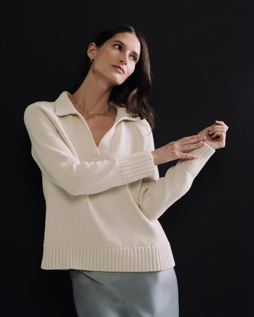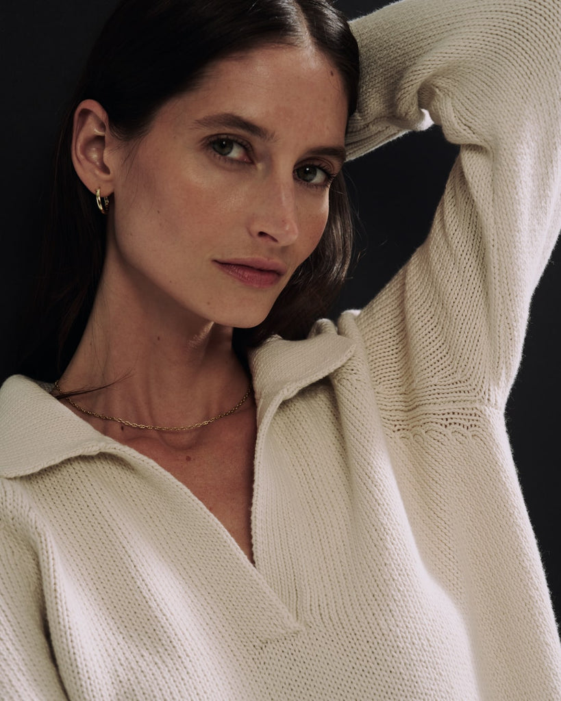 The Avery Sweater is relaxed yet refined—designed with a classic Johnny collar that can be worn folded or standing for a touch of quiet attitude. Crafted from soft, Italian-spun Turkish cotton, it offers a laid-back silhouette with elevated texture and comfort.